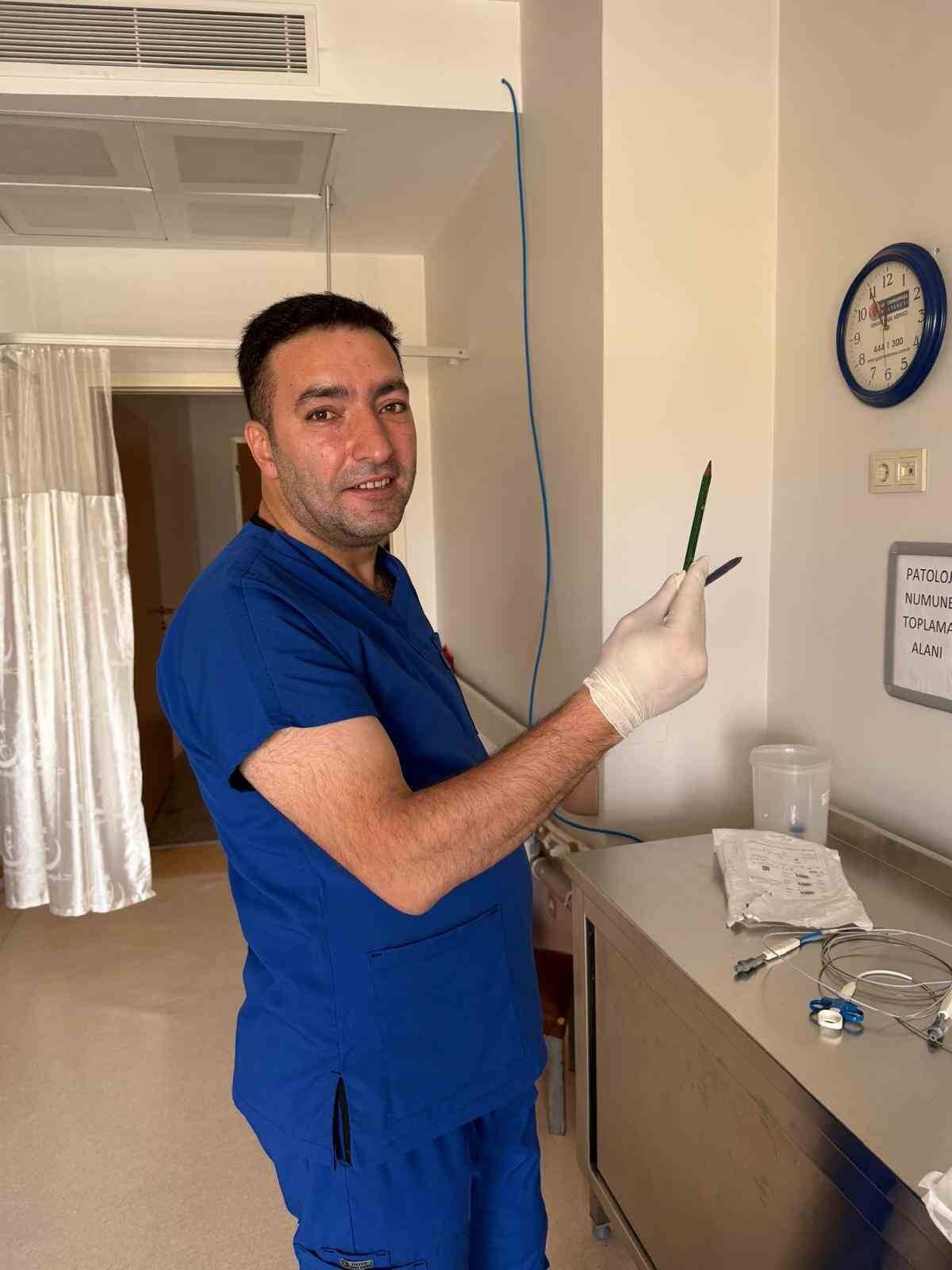 Operasyonu gerçekleştiren Dr. Öğretim Üyesi Adem Aslan, ilk kez böyle bir vakayla karşılaştıklarını belirterek, “22 yaşındaki bayan hastamız kalem yutma şikayetiyle ilçe devlet hastanemize başvurmuştu. Tomografisinde midesinde yabancı cisim olduğu görüldü. Biz de tetkiklerimizde midesinde kalem olduğunu gözlemledik. Daha önce toplu iğne, kemik parçası gibi yabancı cisimlerle karşılaşıyorduk ama bu kadar uzun ve ince bir cisim ilk kez karşımıza çıktı. Midenin boşalması için bir gün bekledik ve ertesi gün yaptığımız endoskopide hastanın bir değil iki kalem yuttuğunu gördük. Yaklaşık bir buçuk saat süren işlemde kalemleri endoskopik yöntemle çıkardık. Hastamızın Obsesif Kompulsif Bozukluğu olduğu için ailesine yalnız bırakmamalarını ve bu tür cisimleri ortalıkta bulundurmamalarını tembih ettik. Bir gün müşahede altında tuttuktan sonra şifa ile taburcu ettik” dedi.