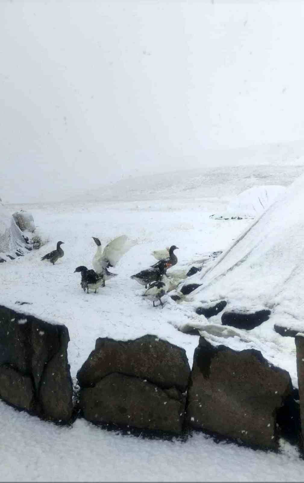 Benzer görüntüler Hamur ilçesindeki Aladağ bölgesinde de yaşandı. Kar yağışının etkili olduğu yaylalarda hayvan sürülerini otlatan çobanlar, yoğun yağış sebebiyle sürülerini köye geri götürmek zorunda kaldı.