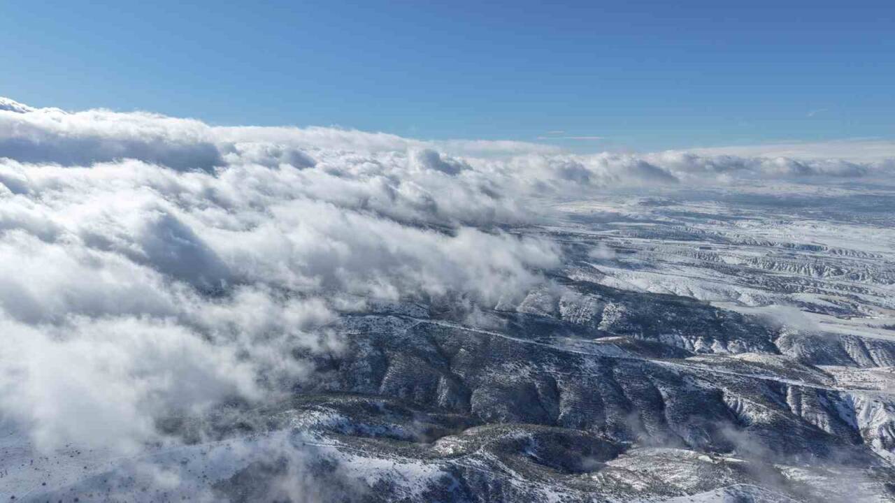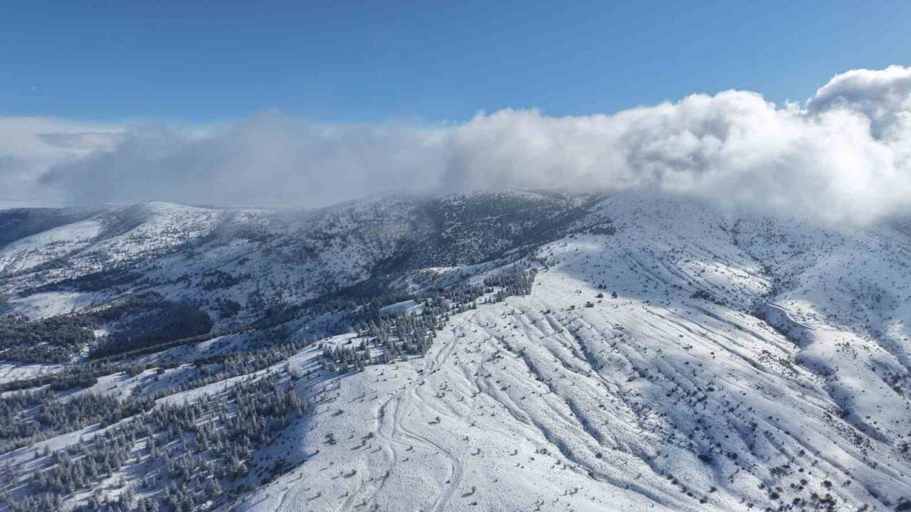 Kırıkkale’nin Balışeyh ilçe sınırlarında bulunan bin 744 rakıma sahip Dinek Dağı, 2026 yılının ilk gününde etkili olan kar yağışıyla beyaza büründü. Soğuk havanın hakim olduğu bölgede, karla kaplanan dağ ve üzerinde süzülen yoğun bulutlar havadan görüntülendi. Ortaya çıkan manzara kartpostallık görüntüler oluşturdu.