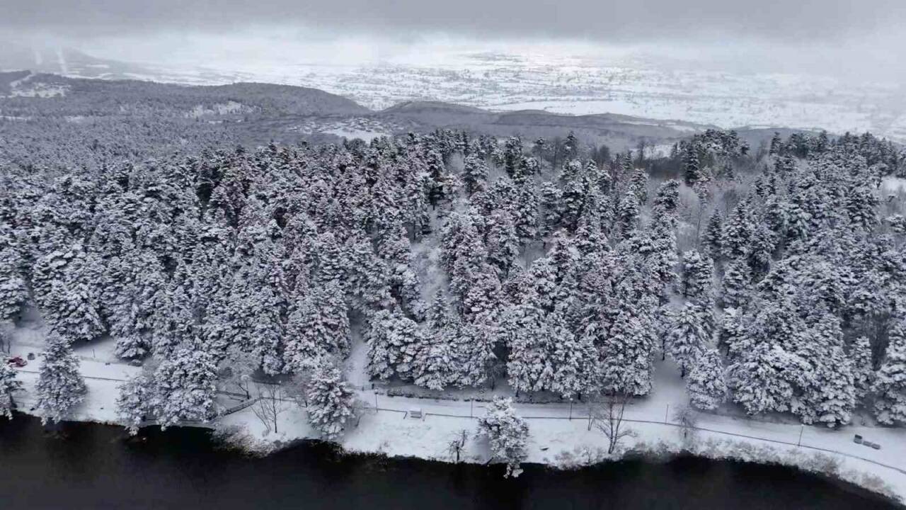 Bolu’nun doğa harikası Gölcük Tabiat Parkı, kar yağışının ardından beyaz gelinliğini giydi. Çam ormanlarının arasındaki saklı cennetin beyaz örtüyle kaplandığı kartpostallık manzara, havadan dron ile görüntülendi.
