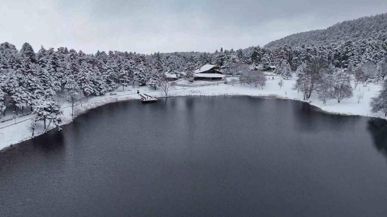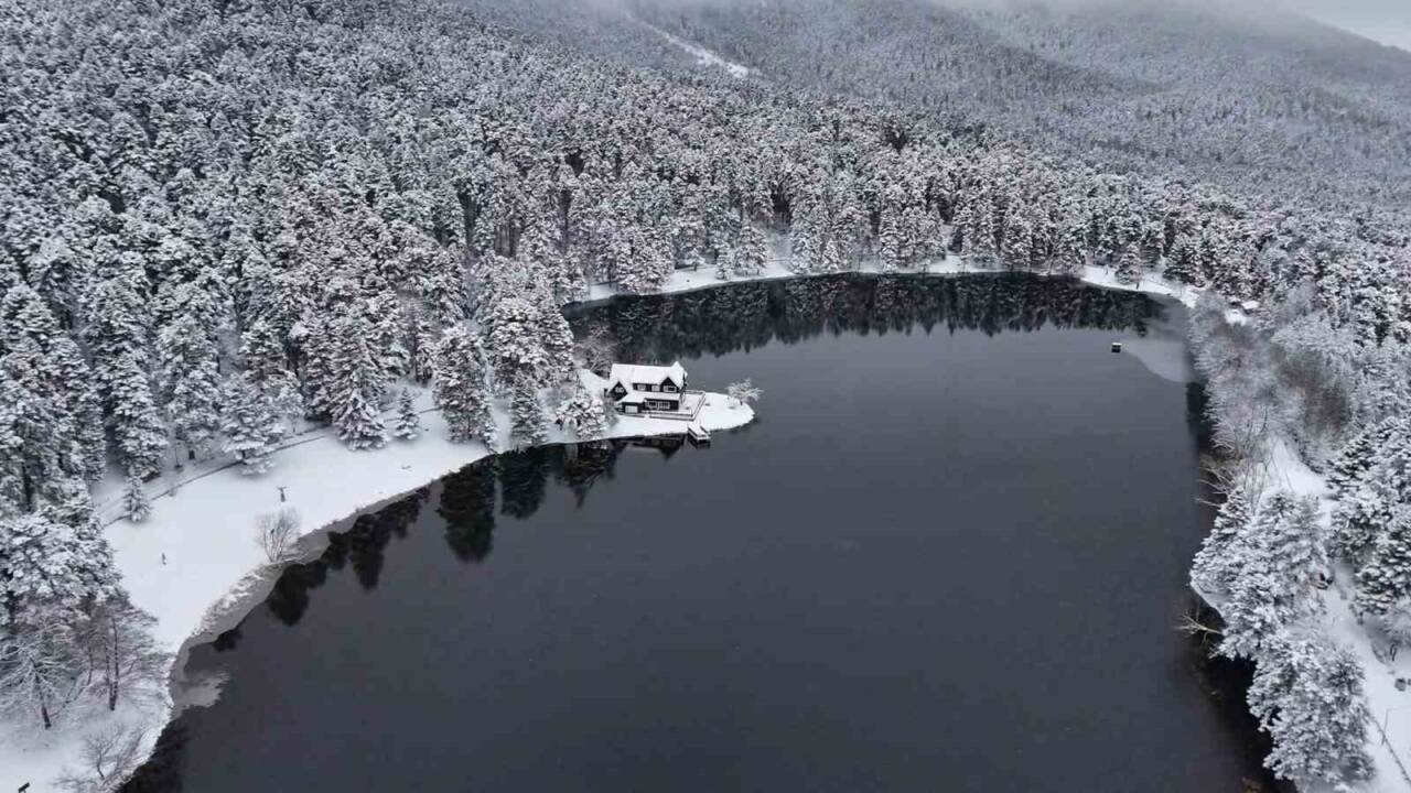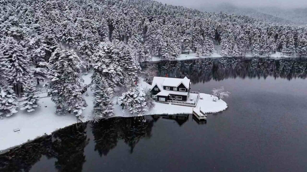 Bolu kent merkezine yaklaşık 13 kilometre uzaklıkta bulunan ve her mevsim yerli ve yabancı turistlerin uğrak noktası olan Gölcük Tabiat Parkı’nda, etkili olan kar yağışı sonrası seyrine doyumsuz manzaralar oluştu. Hava sıcaklığının sıfırın altına düştüğü bölgede, gölün çevresini saran çam ormanları ve simge haline gelen Devlet Konukevi tamamen beyaza büründü. ‘Beyaz gelinliğini’ giyen tabiat parkı, havadan dron ile görüntülendi. Ortaya çıkan kartpostallık manzaralar, görenleri hayran bıraktı.
