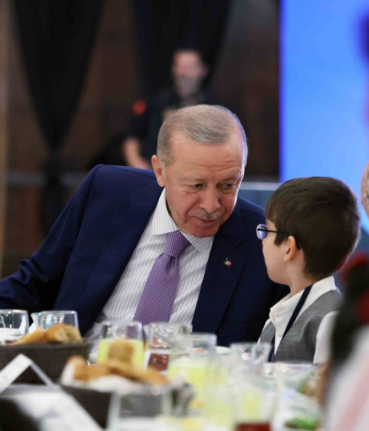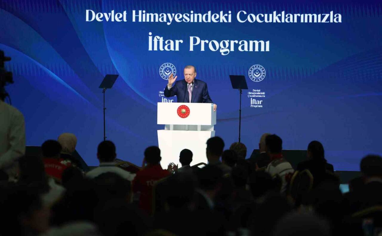 Cumhurbaşkanı Recep Tayyip Erdoğan, Haliç Kongre Merkezi’nde düzenlenen Devlet Himayesindeki Çocuklarla İftar Programı’na katıldı. Cumhurbaşkanı Erdoğan programda yaptığı konuşmada, “Milletimiz ve tüm kurumlarımızla birlikte üzerine titrediğimiz her bir evladımızı sevgiyle selamlıyorum. Çocuklarımızın tamamına Gazze ve Suriye başta olmak üzere gönül coğrafyamızdaki tüm çocuklarımıza muhabbetimi ve selamlarımı gönderiyorum. Yüzlerinizdeki tebessümün hayatınız boyunca hiç eksik olmamasını Rabbim’den niyaz ediyorum. Şartlar ne olursa olsun sizlerden şunu asla unutmamanızı rica ediyorum. Sizler bizim evlatlarımızsınız, göz bebeklerimizsiniz. Sizler çok büyük bir milletin çocuklarısınız. Devletimiz sizleri hayata en güçlü şekilde hazırlamak için ne yapılması gerekiyorsa bundan sonra da yapacaktır. Hayatınızın her anında sizin yanınızda olmaya devam edeceğiz. Sizler de vatanınıza hizmet edeceksiniz. Bizden devralacağınız bayrağı daha da yükseklere taşıyacaksınız” dedi.