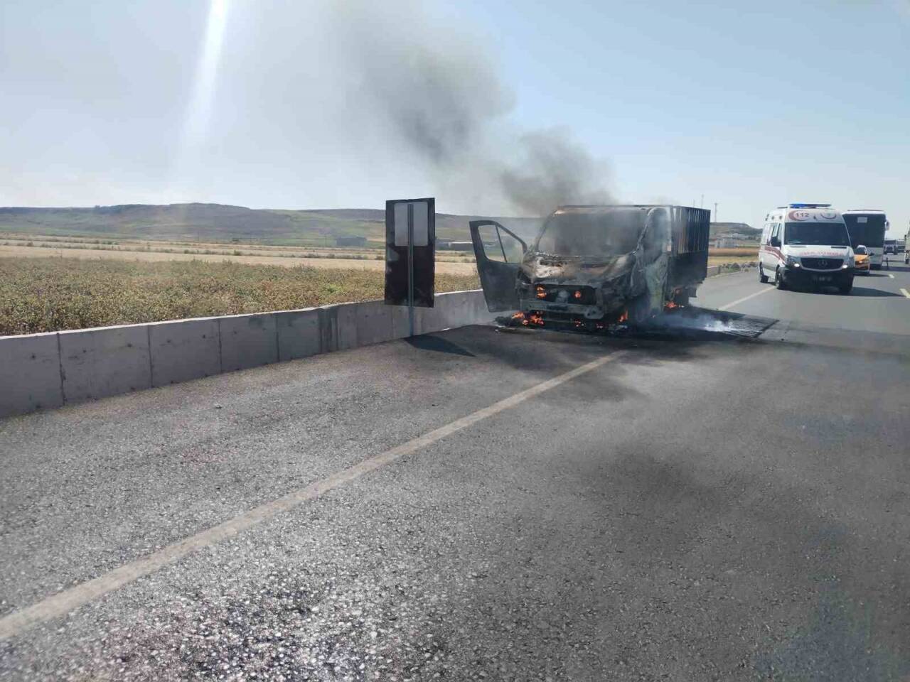 Diyarbakır’ın Bismil ilçesinde seyir halindeki kamyonet, alev alması sonucu kullanılamaz hale geldi.