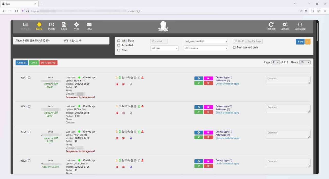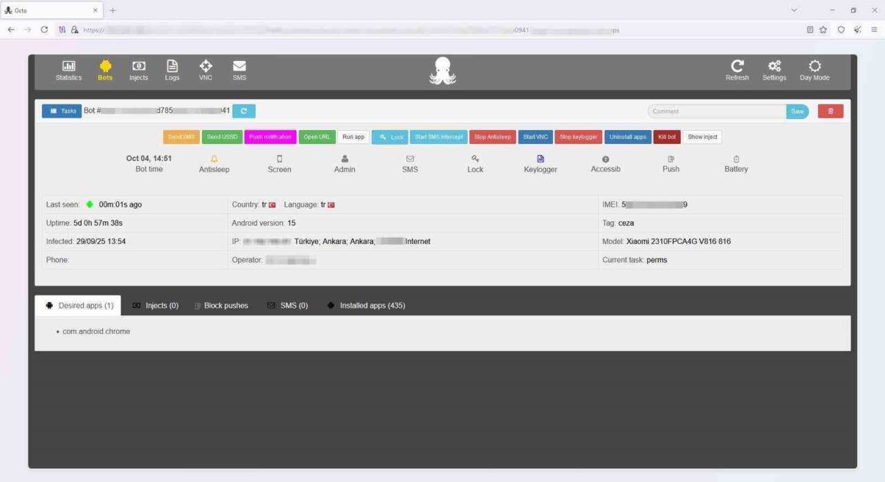 Operasyonda ayrıca, siber suç örgütünün mobil telefonlara yüklediği zararlı yazılımları yönetmek amacıyla kullandığı özel kontrol paneli de ele geçirildi. Bu panel vasıtasıyla telefonların tamamen kontrol altına alındığı, kullanıcıların bilgisi dışında üçüncü kişilere SMS gönderilebildiği, gelen ve giden çağrıların yönlendirilebildiği, cihazın kamerası ve ekranının uzaktan izlenebildiği ve anlık konum bilgilerinin takip edilebildiği tespit edildi.