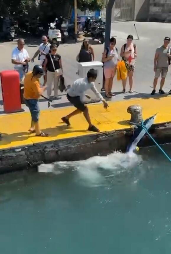 Muğla’nın Bodrum ilçesinde nesli tükenme tehlikesiyle karşı karşıya olan mavi yelken balığı zıpkınla vuruldu. Vatandaşlar balığın vurumasına tepki gösterdi.