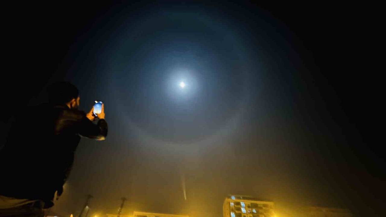 Hakkari’nin Yüksekova ilçesinde ayın etrafında nadir görülen hale oluştu. Vatandaşlar telefonlarına sarılarak o anları kayıt altına aldı.