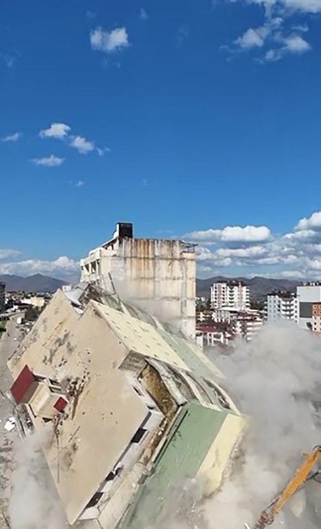 Hatay'ın Hassa ilçesinde bulunan 9 katlı bir bina, iş makinesi ile gerçekleştirilen kontrollü yıkım sırasında dron görüntüleriyle kayıt altına alındı.