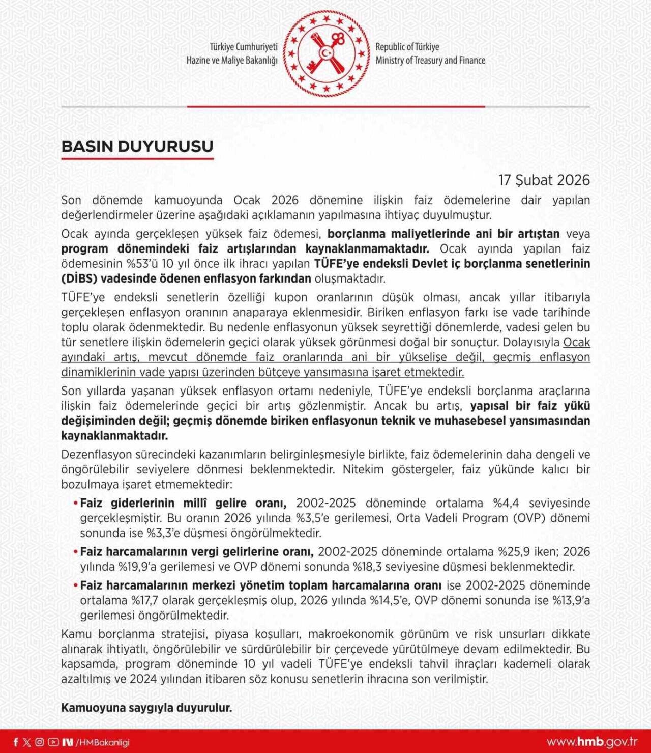 Hazine ve Maliye Bakanlığı, kamuoyunda Ocak 2026 dönemine ilişkin faiz ödemeleriyle ilgili yapılan değerlendirmeler üzerine bir açıklama yaptı. Yapılan açıklamada, "Son dönemde kamuoyunda Ocak 2026 dönemine ilişkin faiz ödemelerine dair yapılan değerlendirmeler üzerine aşağıdaki açıklamanın yapılmasına ihtiyaç duyulmuştur. Ocak ayında gerçekleşen yüksek faiz ödemesi, borçlanma maliyetlerinde ani bir artıştan veya program dönemindeki faiz artışlarından kaynaklanmamaktadır. Ocak ayında yapılan faiz ödemesinin yüzde 53’ü 10 yıl önce ilk ihracı yapılan TÜFE’ye endeksli devlet iç borçlanma senetlerinin (DİBS) vadesinde ödenen enflasyon farkından oluşmaktadır. TÜFE’ye endeksli senetlerin özelliği kupon oranlarının düşük olması, ancak yıllar itibarıyla gerçekleşen enflasyon oranının ana paraya eklenmesidir. Biriken enflasyon farkı ise vade tarihinde toplu olarak ödenmektedir. Bu nedenle enflasyonun yüksek seyrettiği dönemlerde vadesi gelen bu tür senetlere ilişkin ödemelerin geçici olarak yüksek görünmesi doğal bir sonuçtur" ifadelerine yer verildi.