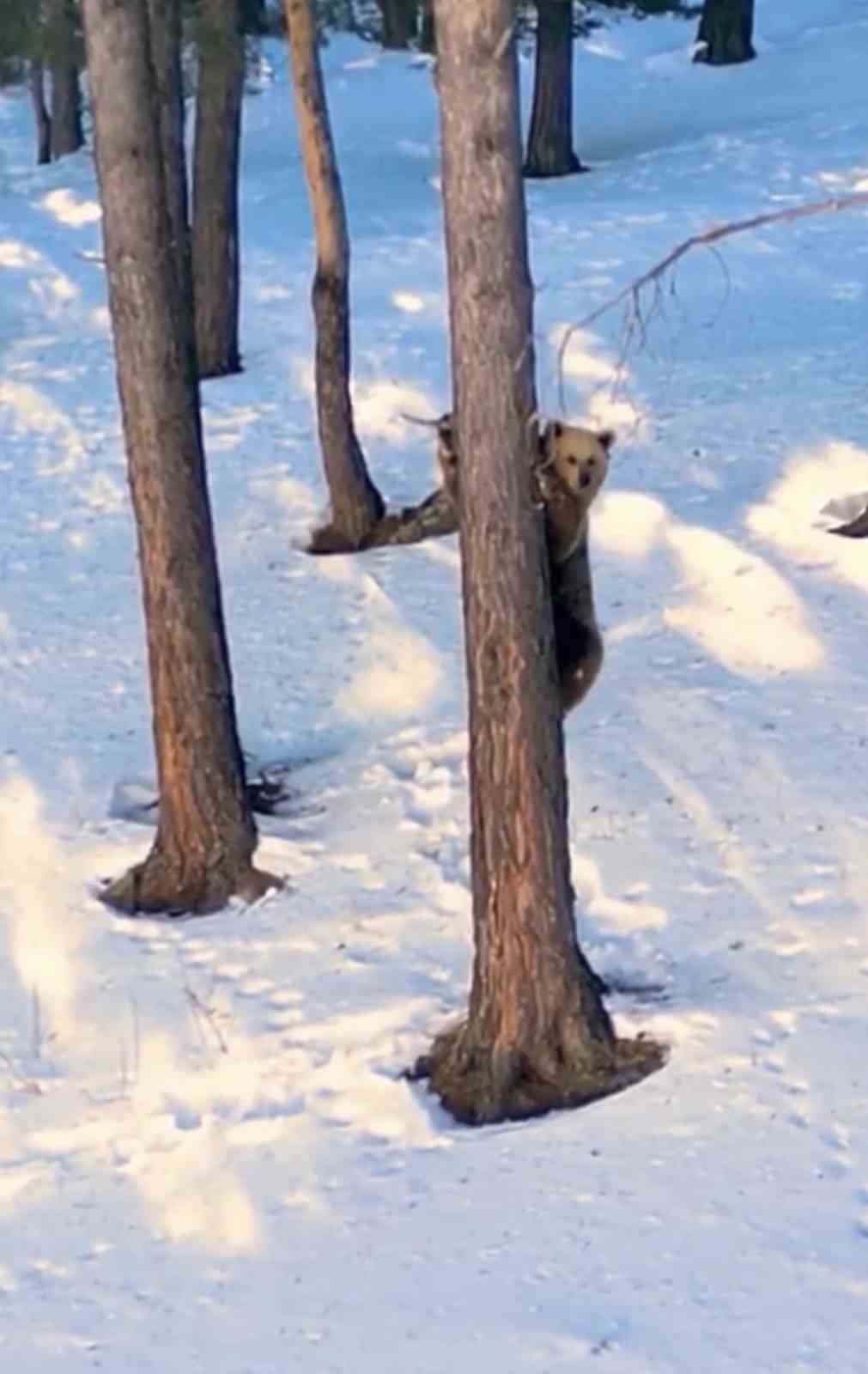 Videoda, Kars’ın Sarıkamış ilçesinde bulunan sarıçam ağaçları arasında, kış uykusundan uyanan dev boz ayının gövdesine sarılıp hızla yukarı çıktığı gözlemleniyor. Bu cüretkâr hareket, orada bulunanları gülümsetti.