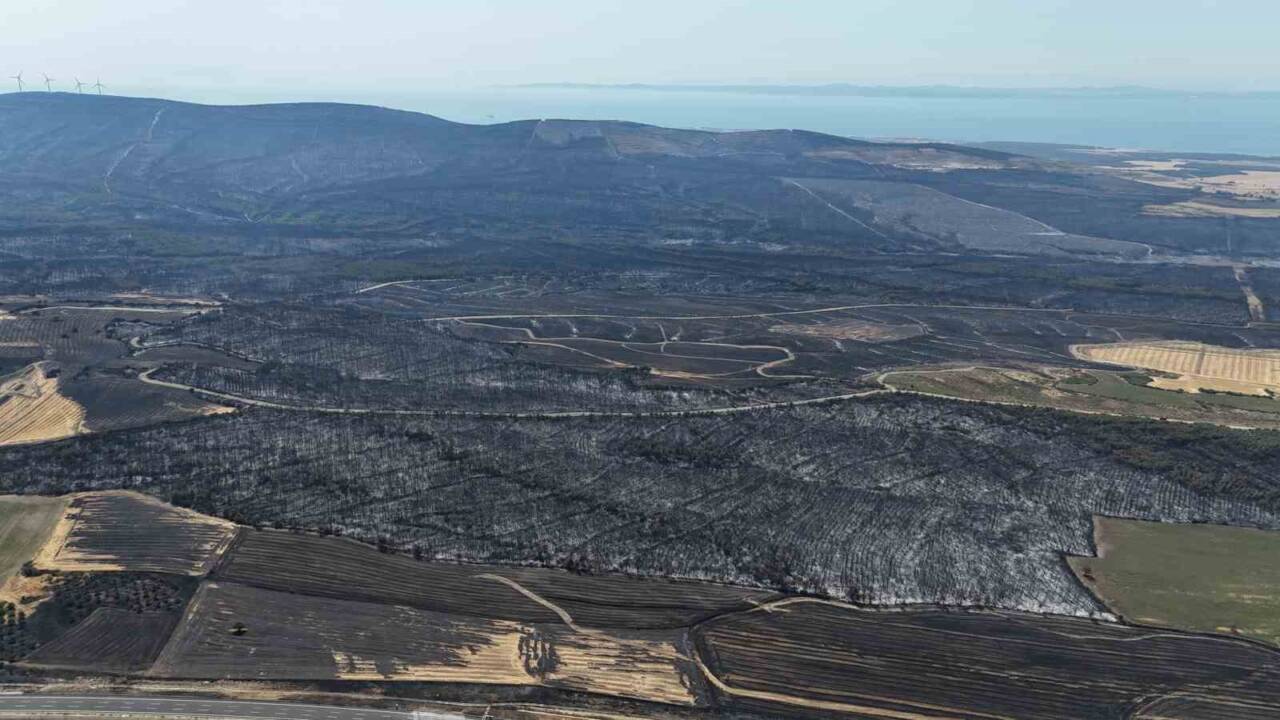Yangında büyük bir alan etkilenirken, yanan alanlar dron görüntülendi. Tekirdağ’ın Şarköy ilçesinde başlayıp, rüzgarında etkisiyle Çanakkale’nin Gelibolu ilçesine ulaşan yangında 119 futbol sahası büyüklüğünde, 85 hektar ormanlık alan zarar gördü.
